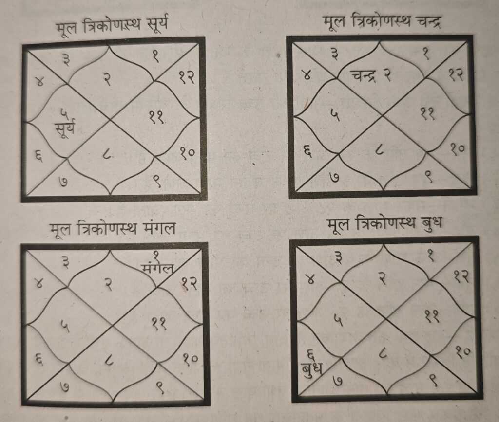 मूल त्रिकोण के ग्रहों की स्थिति को और अधिक स्पष्ट करने के लिए आगे आठ कुण्डलियाँ दी जा रही हैं। इनमें पहली सात कुण्डलियों में प्रत्येक ग्रह को अलग-अलग मूल त्रिकोण में स्थित दिखाया गया है तथा अंतिम कुण्डली में मूल त्रिकोण के सभी ग्रहों को एक साथ अपनी-अपनी राशि में स्थित दिखाया गया है, अतः इन्हें देखकर मूल त्रिकोणस्थ ग्रहों के विषय में भली-भांति जानकारी प्राप्त कर लेनी चाहिए। ये कुण्डलियाँ वृष लग्न की हैं। इन्हीं के आधार पर अन्य लग्न वाली कुण्डलियों के विषय में भी भी समझ लेना चाहिए।