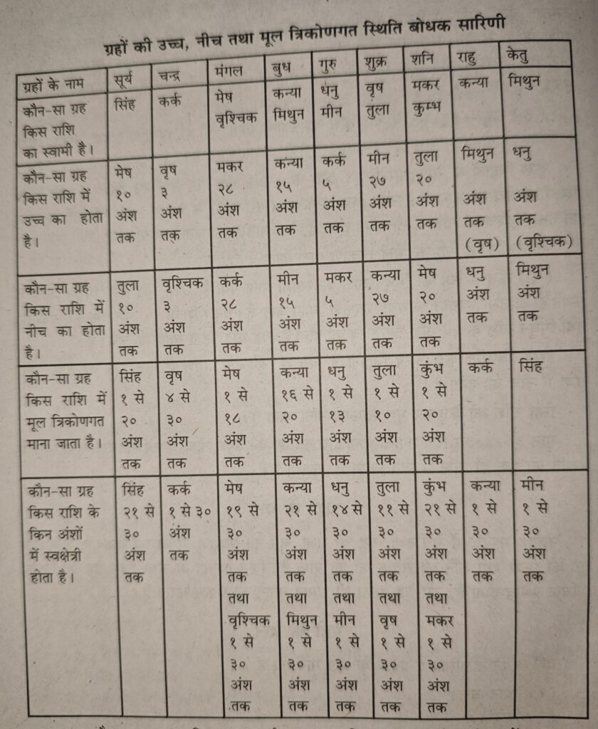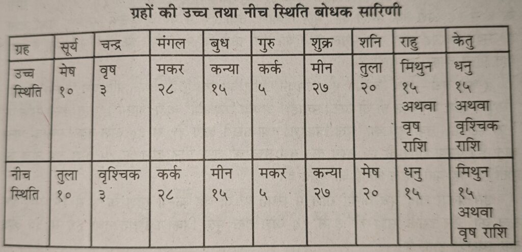 नीचे दिये गए सारिणी में ग्रहों की उच्च तथा नीच स्थिति को प्रदर्शित किया गया है :