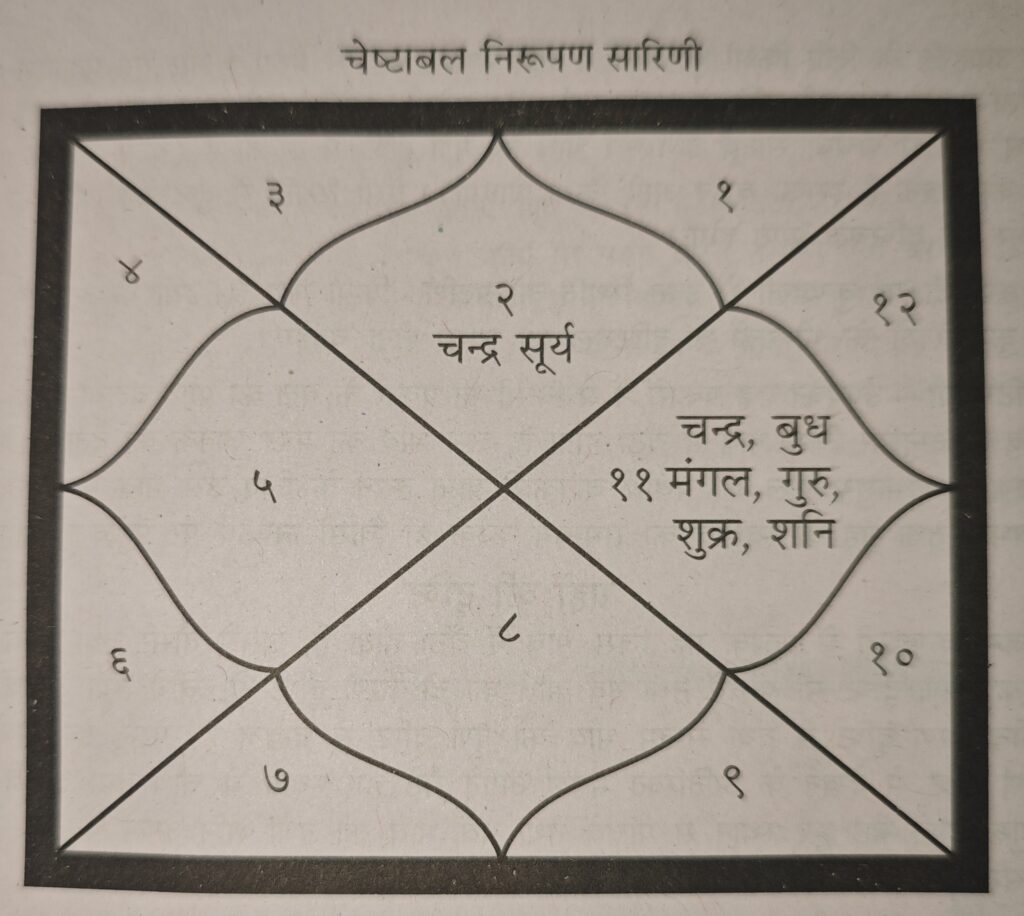 (5) चेष्टाबल – मकर राशि से मिथुन राशि तक किसी भी राशि में रहने से सूर्य तथा चन्द्रमा चेष्टाबली होते हैं एवं मंगल, बुध, बृहस्पति, शुक्र तथा शनिश्चर – ये ग्रह चन्द्रमा के साथ रहने से चेष्टाबली होते हैं।