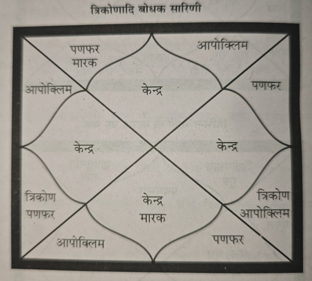 त्रिकोण, केन्द्र, पणफर, आपोक्लिम तथा मारक किन-किन भावों को कहा जाता है? इसे नीचे लिखे अनुसार समझना चाहिए :